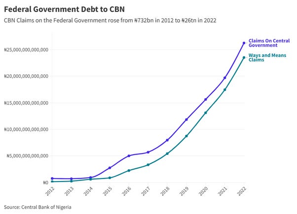 The price for a barrel of Brent crude was $112 dollars in June 2014. It would not hit triple digits again until March 2022. That was bad news for a government committed to a massive spending programme. Rather than cut spending, the government chose to borrow from the markets and the Central Bank of Nigeria.