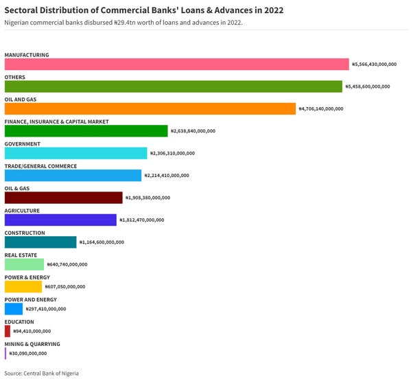 Of that N30tn, Nigerian financiers disbursed N29.4tn to the sectors charted above. Agriculture, at roughly 24% of GDP, receives comparatively limited credit. The duplications reflect a distinction between Industry and Services operators that was present in later but not earlier data.