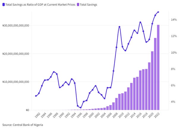 Savings are the source of investment capital. The world’s average gross savings as a percentage of GDP was 27% in 2022, per the World Bank. At 15%, ours is twelve percentage points lower. Roughly, N30tn ($71bn at 2022 exchange rates) was the total amount available for the government, corporates and individuals to borrow in 2022. Any shortfall in demand for investment or consumption has to be supplemented by foreign lenders.
